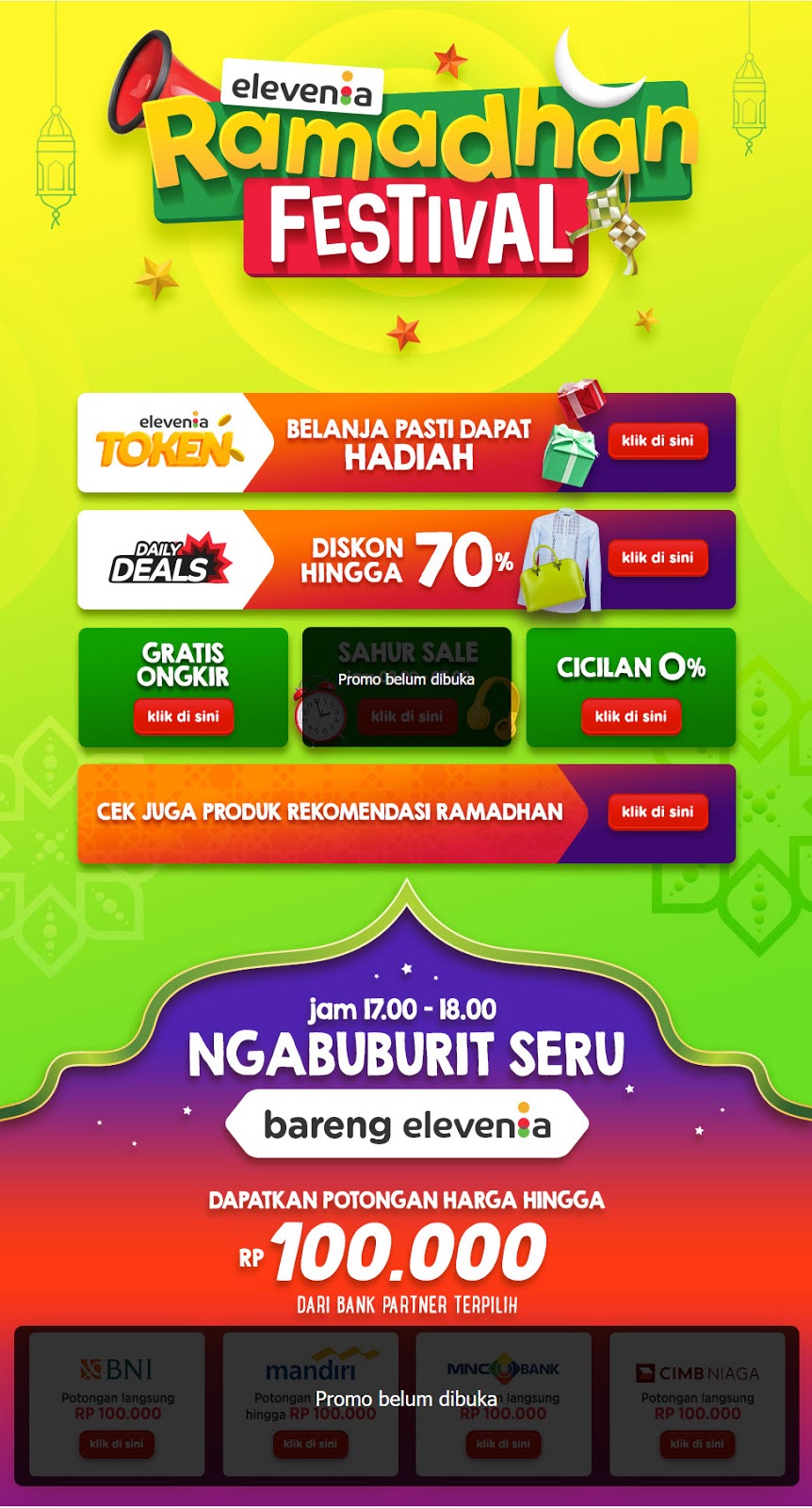Dapatkan promo menarik di ramadhan festival 2018. Mulai promo diskon pulsa, voucher diskon s.d 70%, dll. Yuk pantau saja festivalnya di elevenia.
